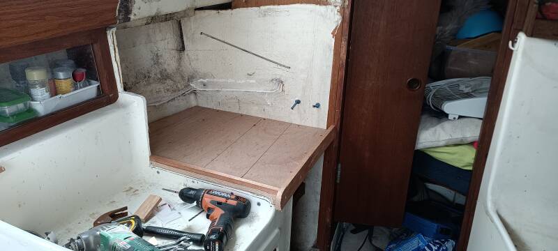 Nu zou je kunnen denken, is dit gedeelte niet een vitaal gedeelte van de ondersteuning van de romp? Nee dus, maar alles wat eronder zit wel! Je kunt dus niet zomaar het hele aanrechtblok weghalen. Dit zit ook erg stevig vast gelamineerd aan de romp. Het deel wat ik heb verwijderd dus niet. Het zat wel aan de bovenkant vast met 2 kleine boutjes aan het schot, maar het schot werd er niet mee ondersteund.