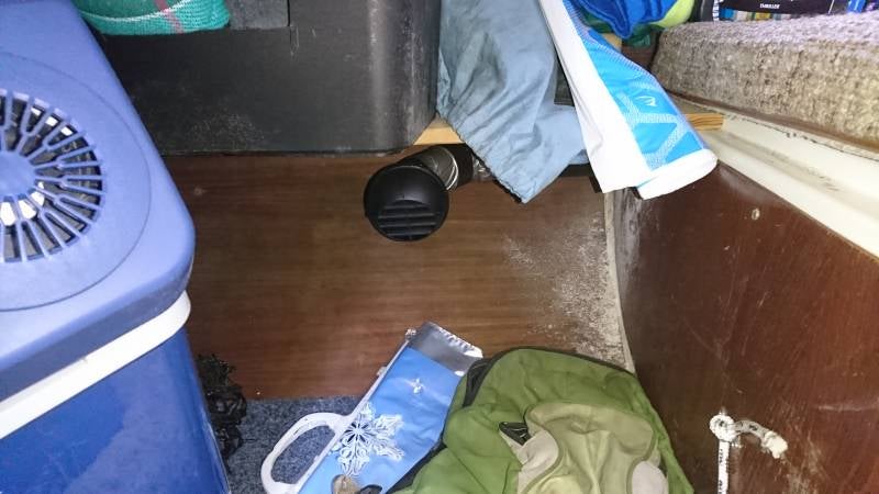 De kachel blaast de warme lucht onder de tafel de kajuit in, en het is ook snel warm!