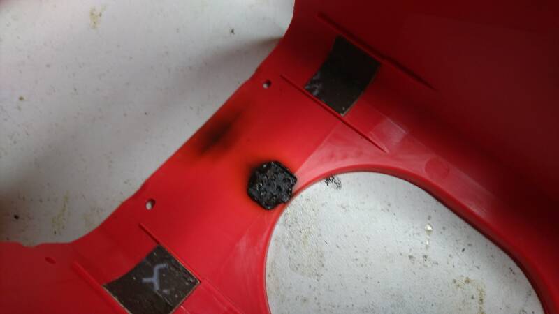 Het eerste wat mij opviel was een zwart vlekje aan de onderkant, naast de uitlaat.Door een boutje waarmee de kachel op een beugel vastzit is de kap op die plek iets naar binnen gedrukt,en kwam tegen het branderhuis aan. Dit is goed op te lossen, en bij het monteren de bout die in de weg zit iets af slijpen.