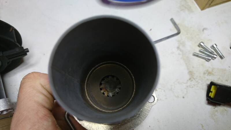 Het branderhuis ook maar eens opengemaakt, en dat was tot mijn verrassing helemaal schoon! Bij een verkeerde lucht/brandstof verhouding, of een vervuild sponsje om de brandstof inlaat, willen deze kacheltjes nogal eens dicht gaan zitten met roet. Geen spoor van te zien!
