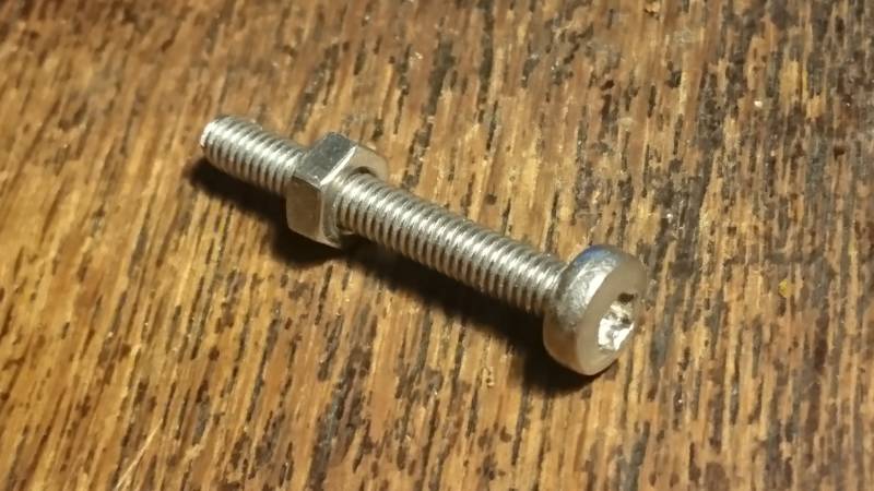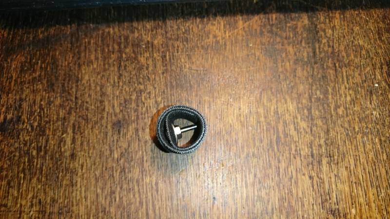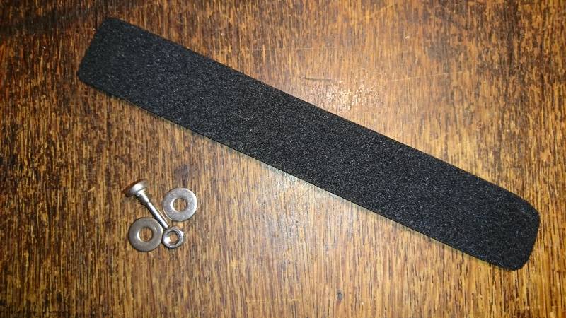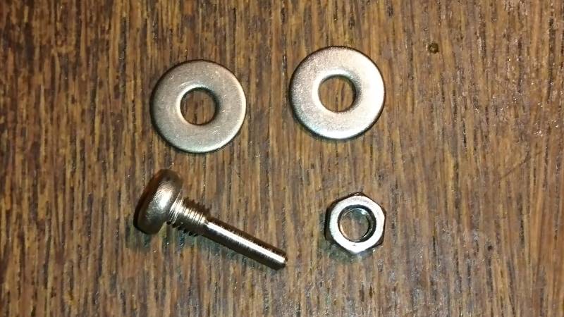 We beginnen met een RVS A4 M4x30 boutje. Ik heb inbus-boutjes met een bolle kop gebruikt, die waren niet duur. En RVS m4 carrosserieringetjes. Verder heb je 2-zijdig klittenband nodig, dat kun je vinden als je zoekt (google) op ¨klittenband dubbelzijdig 20mm¨