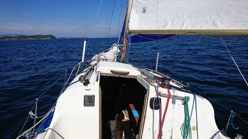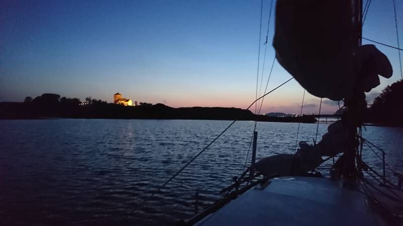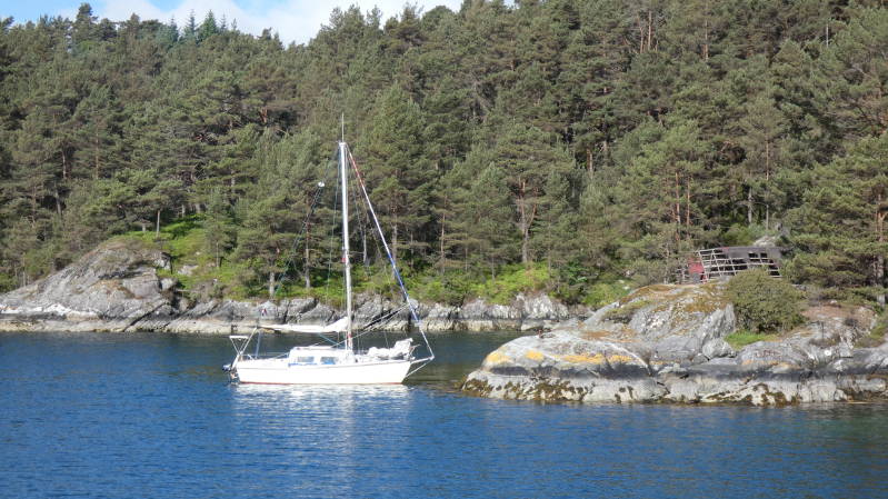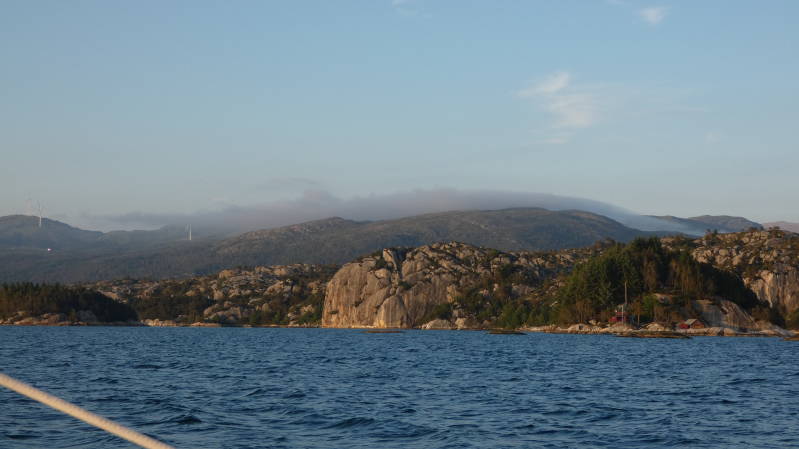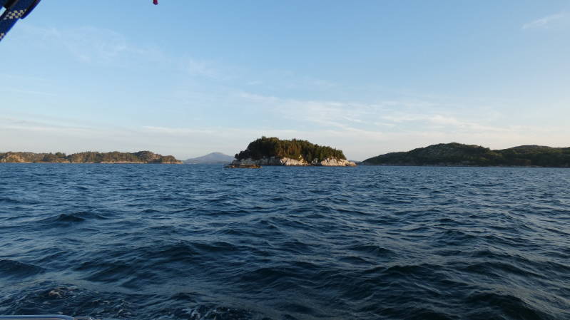 Het eerste stuk, tot Boknafjord, ging voorspoedig. Halve wind, later aan de wind. Doordat ik wat tijd was verloren met dobberen tussen de eilandjes, had ik vanaf Boknafjord wat stroom tegen. Dat wind draaide ook wat meer naar noord west, Dat werd dus kruisen tegen de stroom in. De wind viel, toen ik rond 2000 uur Karmsundet binnenvoer, helemaal weg. Dat werd motoren, gelukkig nog met een beetje stroom mee.