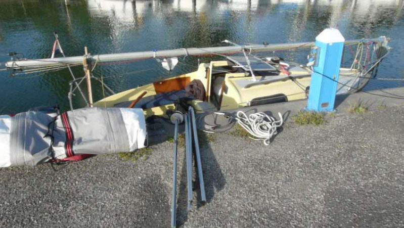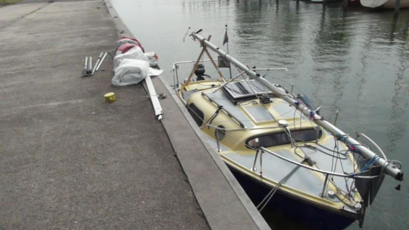 De boot in de Broekerhaven, mast en rolreef (voor de 2de keer!!) ontmanteld..