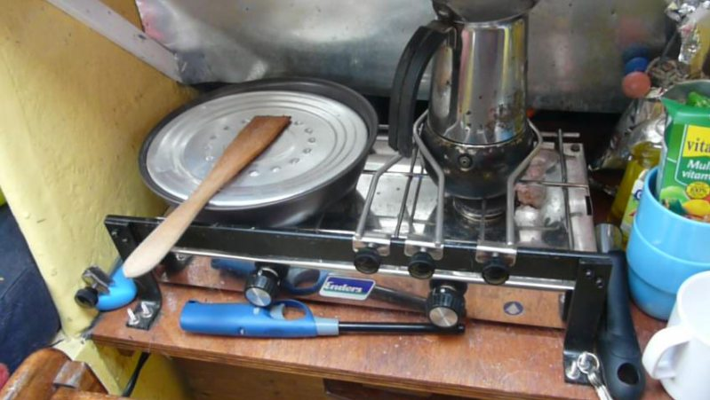 Daar alle spullen weer uit de kajuit gevist, en begonnen met het weer in elkaar zetten van de rolreef met nieuwe voorstag, en de mast er weer op.
