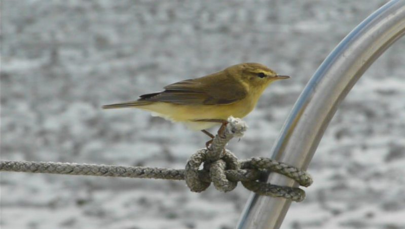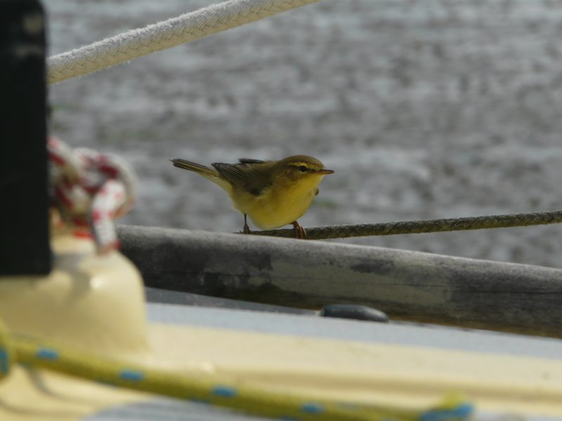 Naast de gebruikelijke vogels, scholeksters, meeuwen, sterntjes, strandlopertjes, etc. Kwam er ook nog een heel bijzonder vogeltje even op de railing uitrusten, een Fitis of Tjiftjaf. dat is bij deze vogeltjes moeilijk te zien, ze zijn eigenlijk alleen door hun zang uit elkaar te houden. http://nl.wikipedia.org/wiki/Fitis