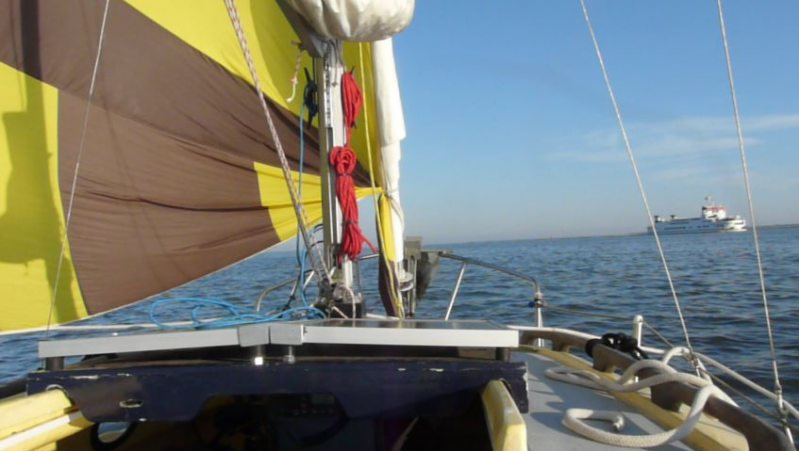 4 dagen later heb ik (weer) een nieuwe voorstag gemonteerd, een dikkere dit keer, en heb ik de boot alsnog naar huis gevaren. Het grootste deel weer op de motor, het werd na de middag behoorlijk windstil...