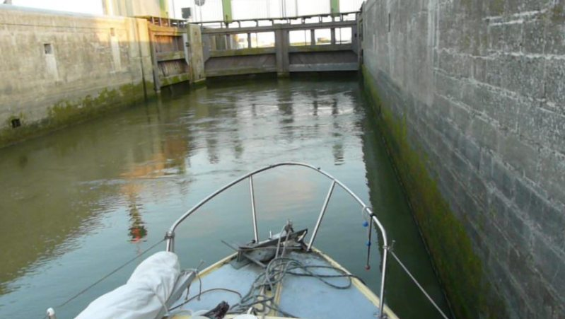 Aangekomen bleek dat de sluis van het kleine haventje waar ik lag, nieuwe sluisdeuren kreeg.. gelukkig mocht ik nog snel met m´n boot er even tussendoor, en naar het buitenhaventje varen.
