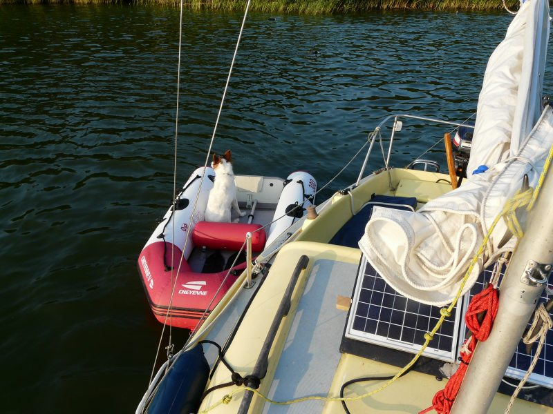 Weer geankerd, en Saar heeft ontdekt dat je vanuit de bijboot heel goed vogeltjes kan kijken, en als de baas dan naar de wal vaart.....